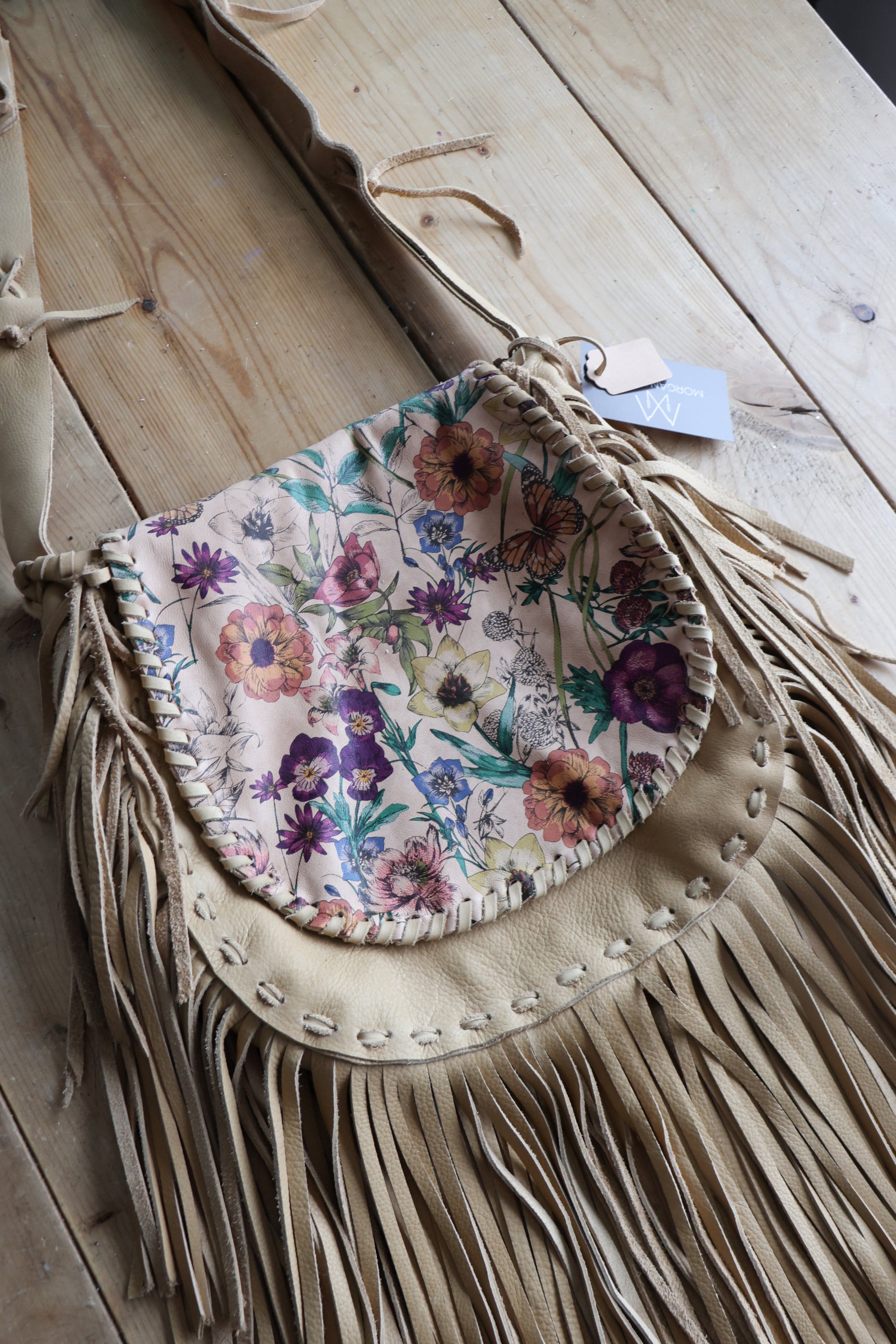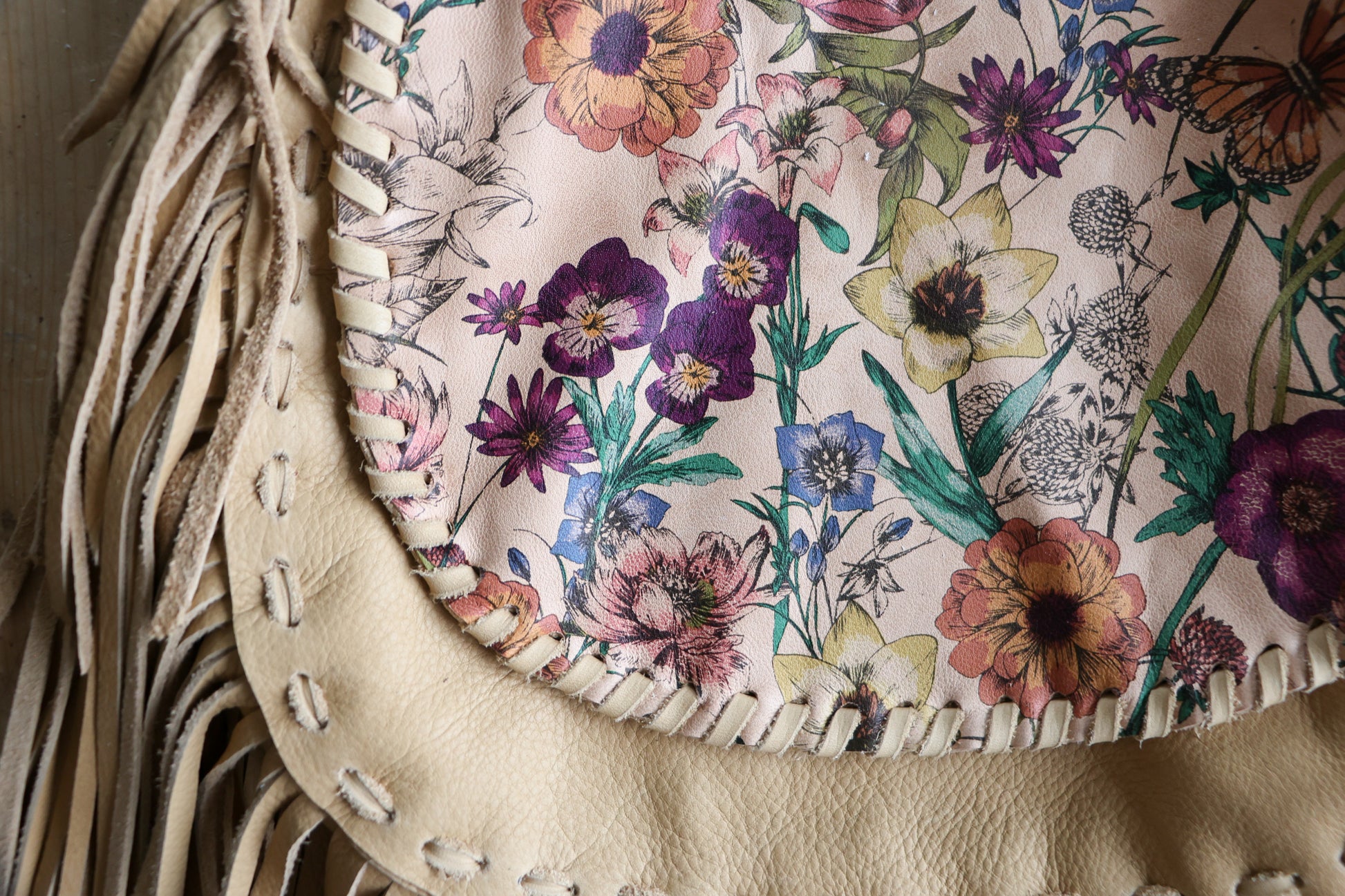 Handcrafted from soft, grain coloured cowhide, with a stunning floral sheepskin flap this carryall is one-of-a-kind; no two hides are the same. Long Hand-cut fringe adds movement and character. This piece is bold, free-spirited and undeniably yours. Spacious, practical and built to turn heads. The Trailblazer is a purse made to carry your story.